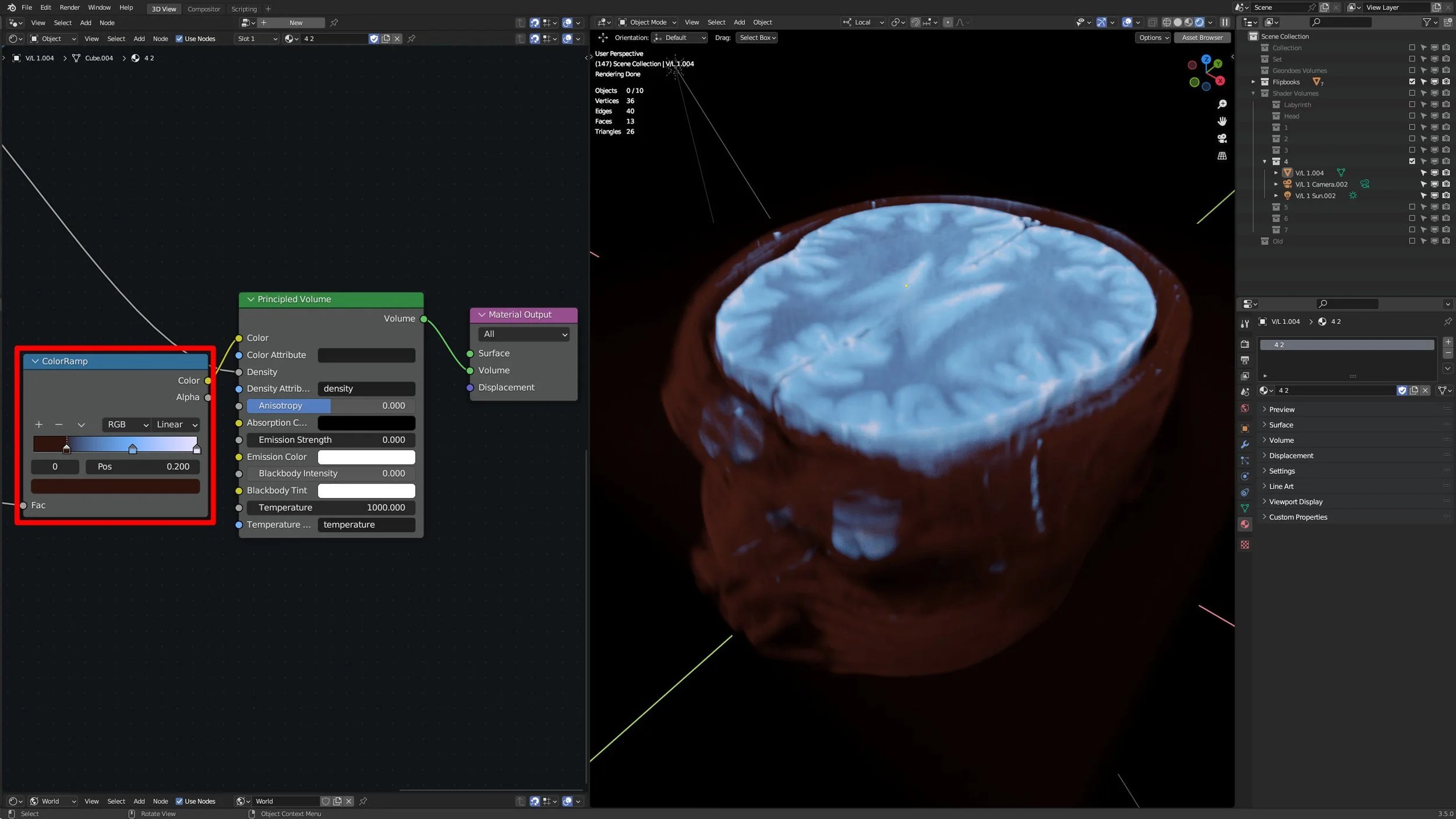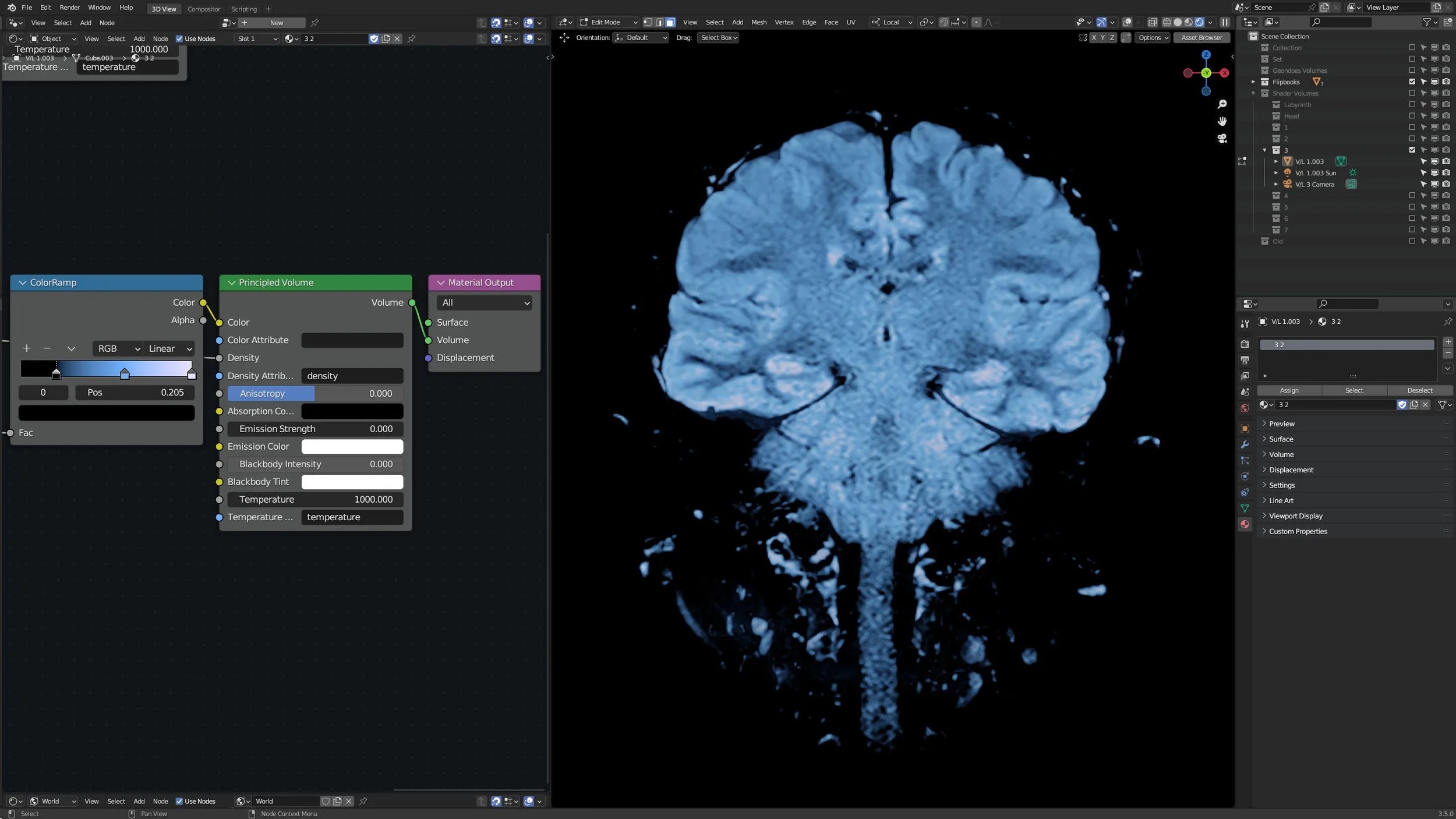 In Blender, we use the Principled Volume shader for creating volumes (alternatives available), which goes hand-in-hand with the Principled BSDF shader for surface materials. There is room for improvement with both of these, but they are effectively our most ‘standardized’ shaders. This is fine for the shader space, but becomes more complicated when creating mesh content from scan data in geometry nodes, for which there are many possible values to create ‘voxelized’ content depending on the combination of nodes used.
